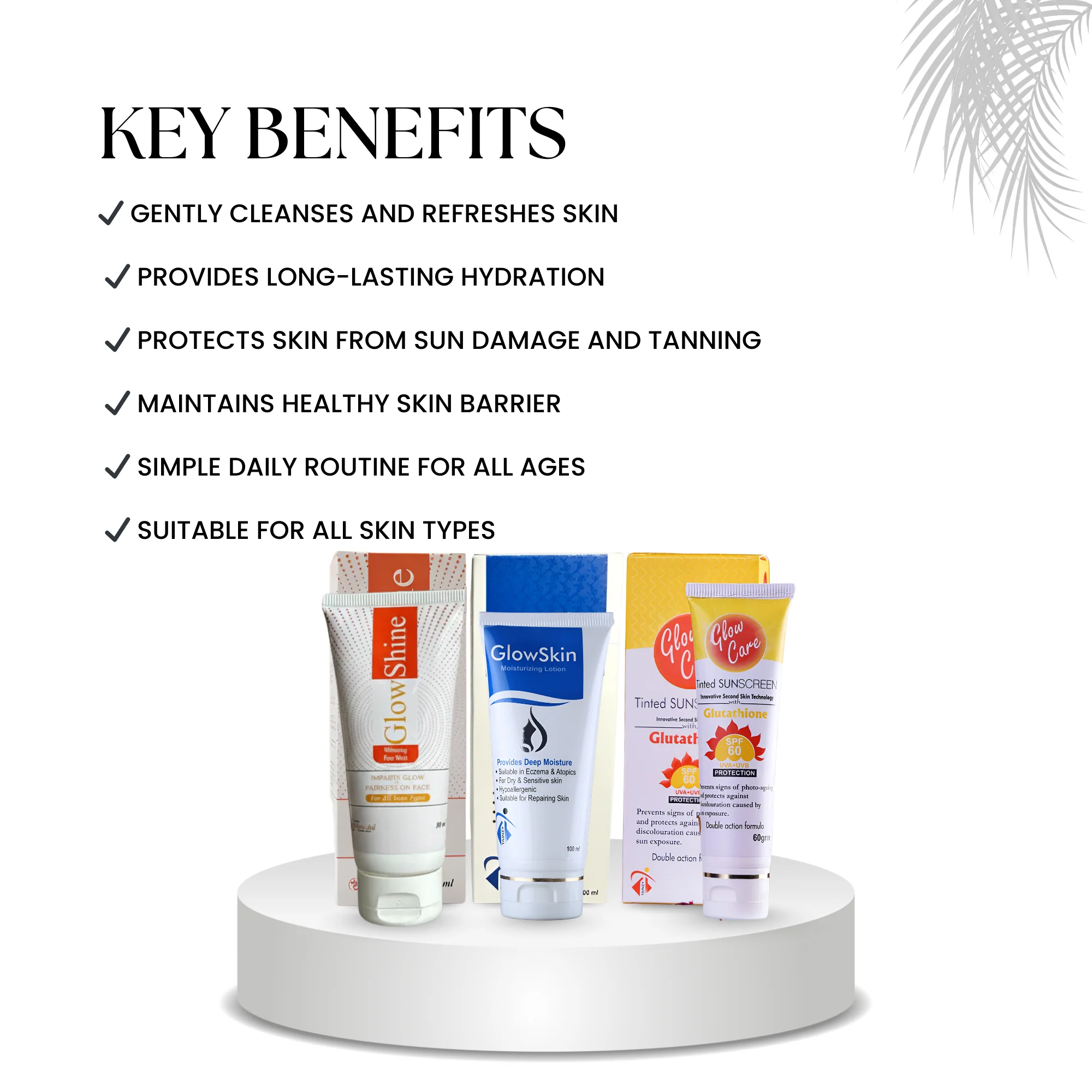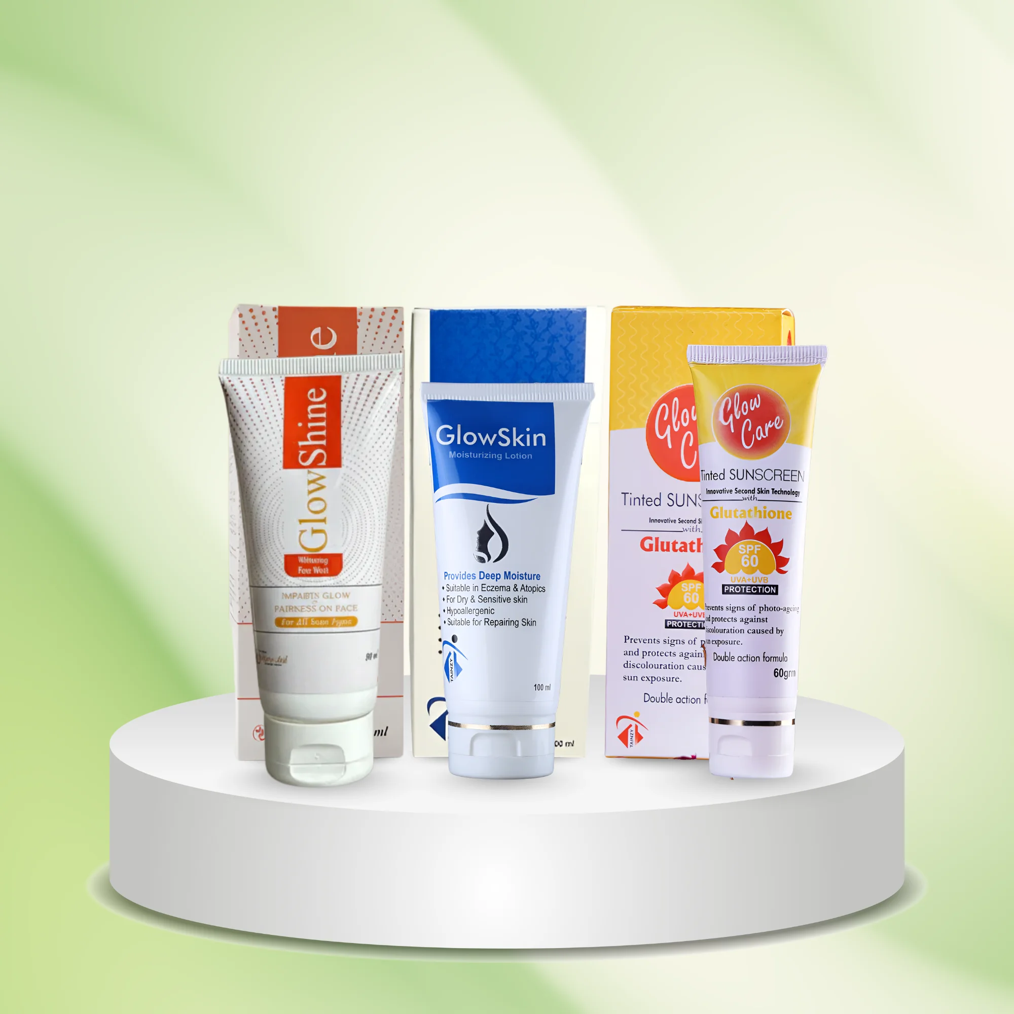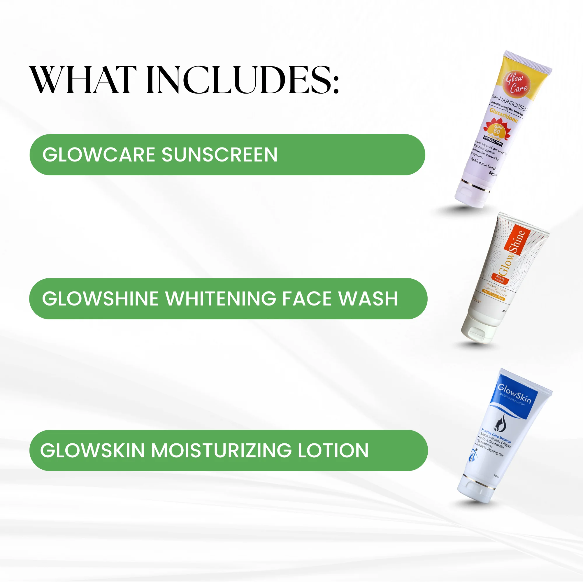 The bundle includes GlowShine Whitening Face Wash to remove dirt, oil, and impurities, GlowSkin Moisturizing Lotion to restore hydration and improve skin softness, and Glowcare Sunscreen to protect skin from harmful UVA & UVB rays.