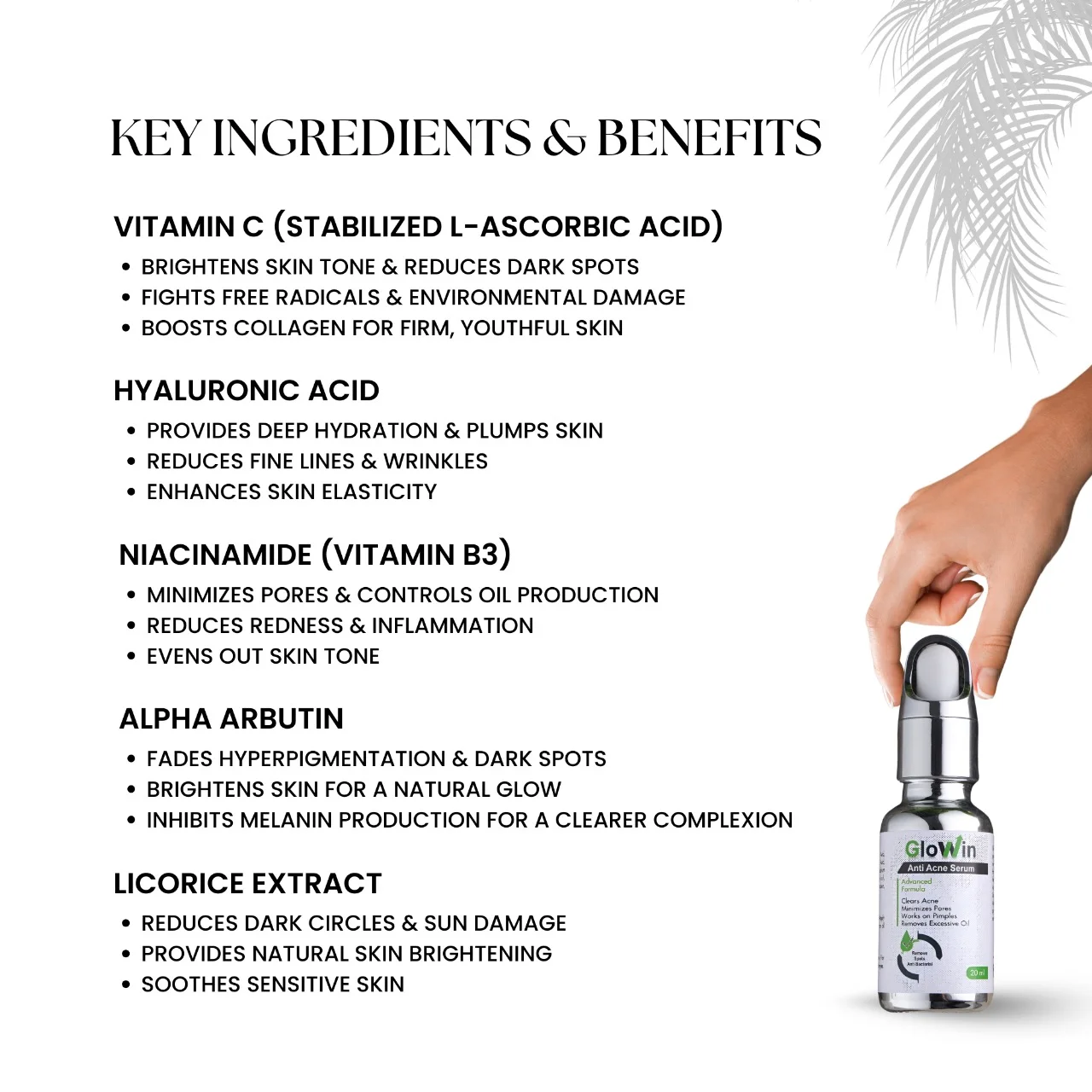 GloWin Anti Acne Serum is a targeted solution for acne-prone skin. Formulated with 2% Salicylic Acid and 10% Azelaic Acid, this serum unclogs pores, reduces inflammation, and prevents future breakouts.